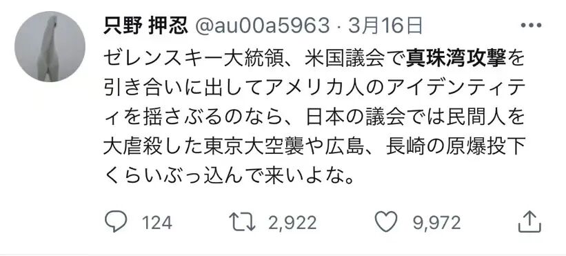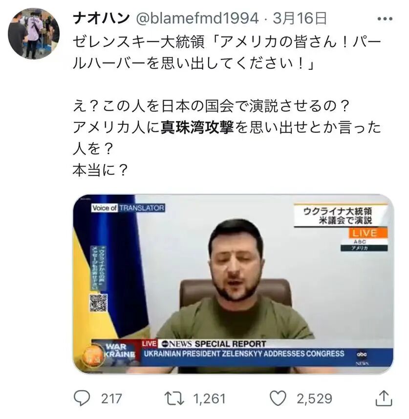 从(珍珠港)这个发言也可看出泽连斯基总统的浅薄。日本在担着风险挺乌克兰,他却在发言里贬低日本。这不是一个聪明人会做的事。