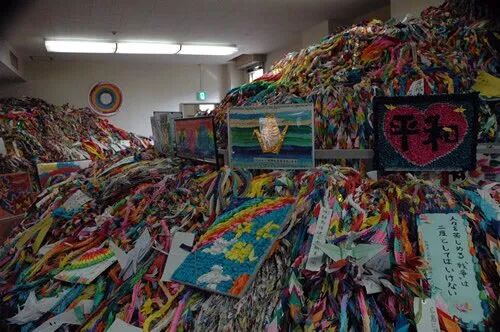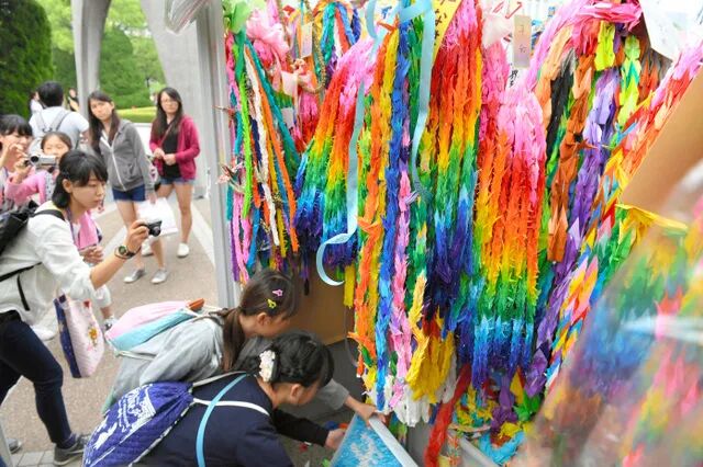 广岛被原子弹炸了以后,为祝愿幸存者能活下来,当时刮起“折千纸鹤”的热潮。学校的孩子们,有大把闲暇时间的大妈们,折了一串一串的千纸鹤,寄去灾区。