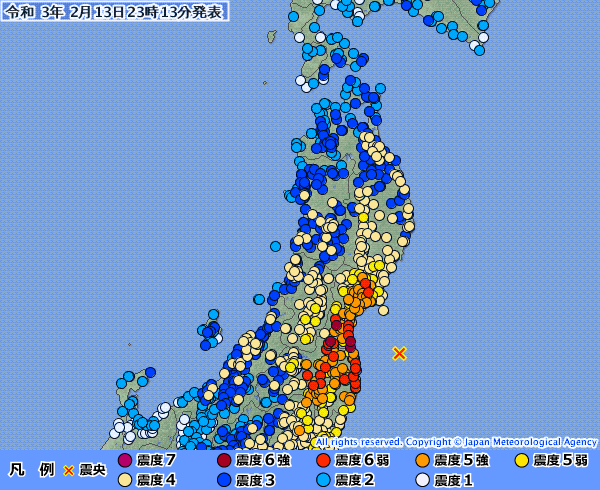 日本当地时间,2月13日23点08分发生7.3级地震(最初估测为7.1级,截至发稿时,重新估测为7.3级)。