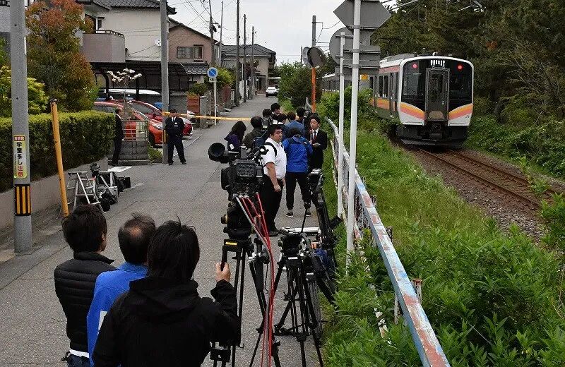 当晚10点30分左右,驶向小针车站的JR越后线电车上,车长看到铁轨上有人,赶紧刹车,但为时已晚,电车撞了上去。