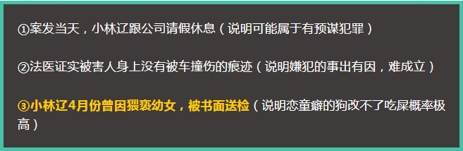 他的黑色汽车没有车祸痕迹,那就不存在突发性的撞到受害人,慌忙下临时起意,杀人灭口,并顺便猥亵受害人。