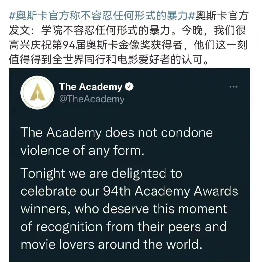 ●学院官推上说:“不允许任何形式的暴力”,那么无论威尔・史密斯的直接暴力,还是克里斯的语言暴力,都应该不被允许才对。