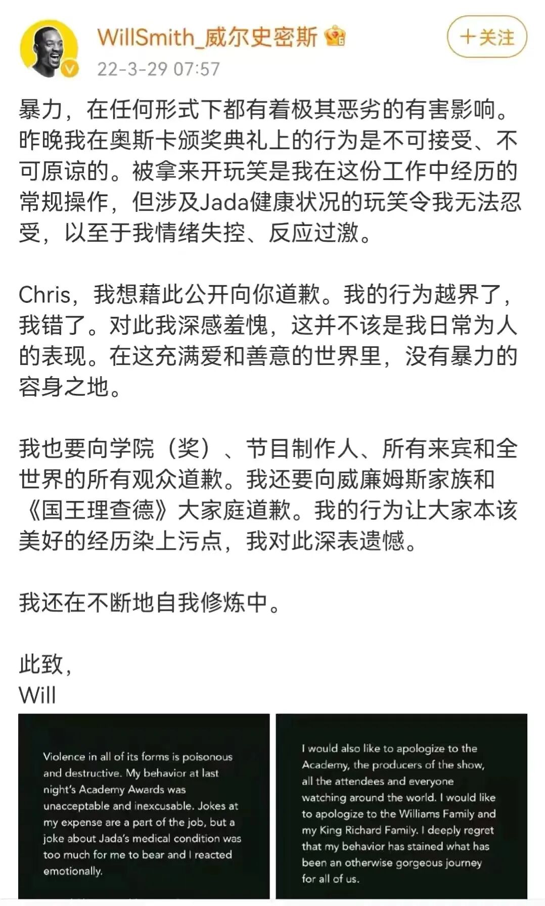 就连史密斯自己,打人之后,上台领奖时已经道歉。典礼结束后,又通过社交平台发出正式道歉。