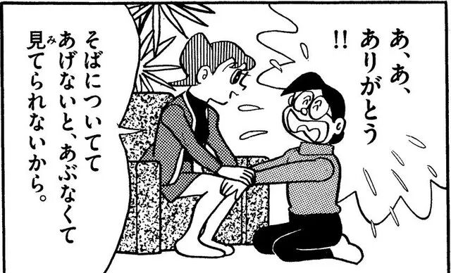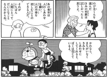 大雄不完美,不够能干,但他能感同身受他人的喜怒哀乐,能够为了静香全力以赴。这点是万能优等生出木杉君身上欠缺的。