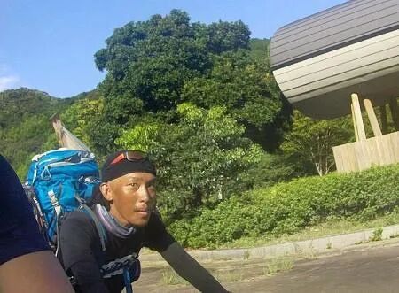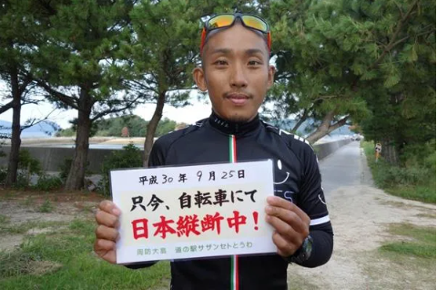 骑到山口县周防大岛町的“道路站”(一种公路休息站),他竟乐呵呵地应邀举起牌子拍下纪念照:平成30年9月25日,正在骑自行车纵贯日本。