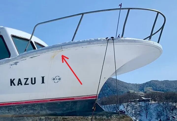去年,“KAZU 1”号曾发生过两次触礁事故。就同行来看,船体前方右侧出现明显龟裂。这道龟裂极可能导致了23日的船体进水。