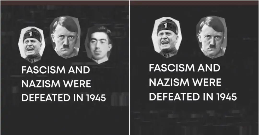 随后,乌克兰政府官推修改视频,把裕仁的头像从法西斯纳粹三人组里除掉。