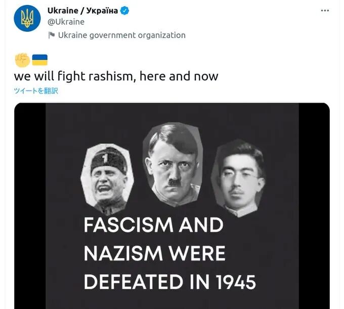 乌克兰官推上传了一个反法西斯的视频,主要是反俄罗斯普京。视频1分11秒的地方,出现“1945年法西斯和纳粹败北”的画面。墨索里尼、希特勒、日本昭和天皇裕仁作为罪恶代表并驾齐驱。