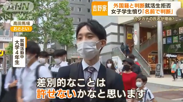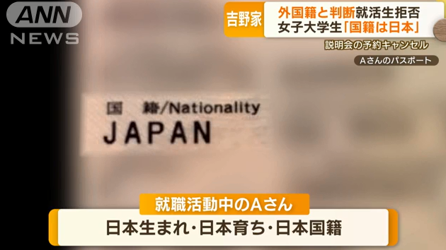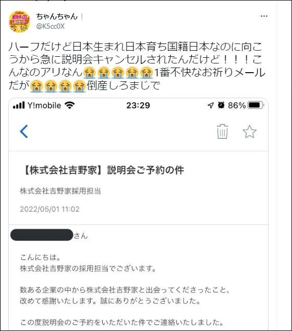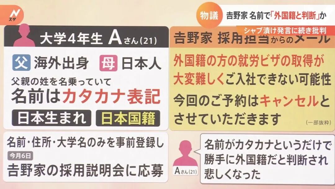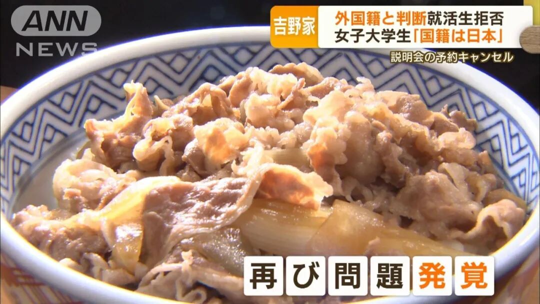 日本一名混血妹子上大四,报名参加吉野家的校招说明会。报上名了,后又收到吉野家发来的邮件,通知她不得不取消她的预约。