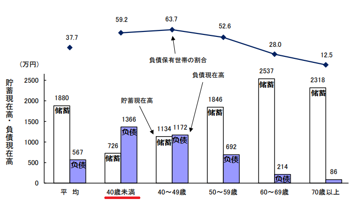 在未满40岁、40~49岁、50~59岁、60~69岁、70岁以上等几个年龄段里,未满40岁的家庭储蓄金额最低,为726万日元(人民币约37.6万),负债金额最高,为1366万日元(人民币约70.8万)。