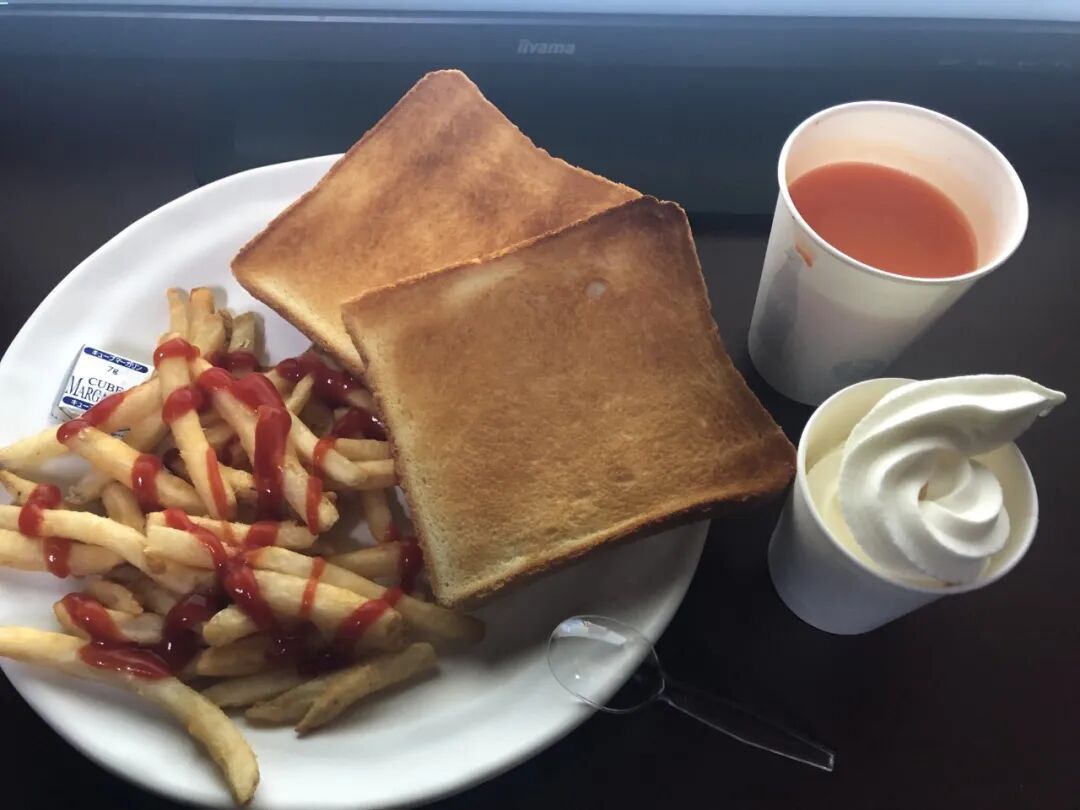 免费的早餐内容很简单,只有吐司、炸薯条、饮料,但是不限量。吐司烤一烤,抹上黄油;炸薯条浇上番茄沙司酱;一杯蔬菜果汁,还挺营养的。