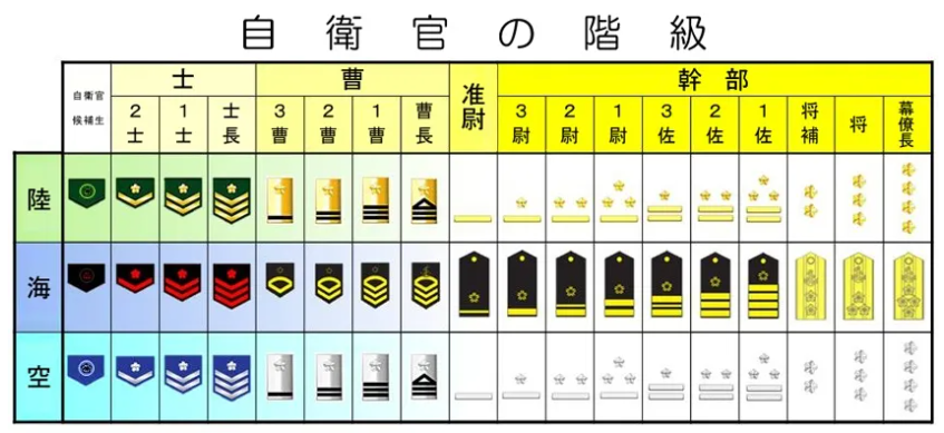 自卫队里,“将、佐、尉” 是干部,军校(防卫大学)出身的,一毕业就是干部跑道;“曹、士”不是干部,非军校出身的普通人入伍必须从底层开始慢慢爬。