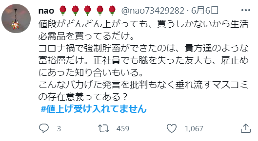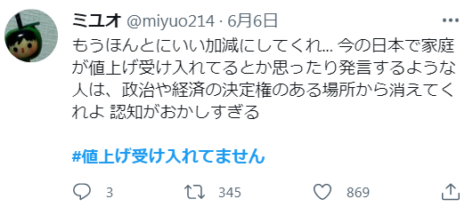 适可而止吧……在眼下的日本,会觉得家庭正在接受涨价什么的,说出这种话的人,从具有政治、经济决定权的位置上消失吧。认知太可笑了。