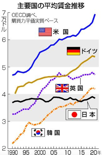 过去的30年里,日本平均薪资的实质性涨幅仅为4%(38515美元)。在发达国家中,处于最低水准,并且已经被它的老冤家韩国反超。