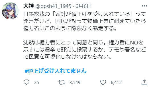 日银总裁的“正在接受家计涨价”发言,老百姓默默忍耐物价上涨的话,权力者就会这样没边儿暴走。