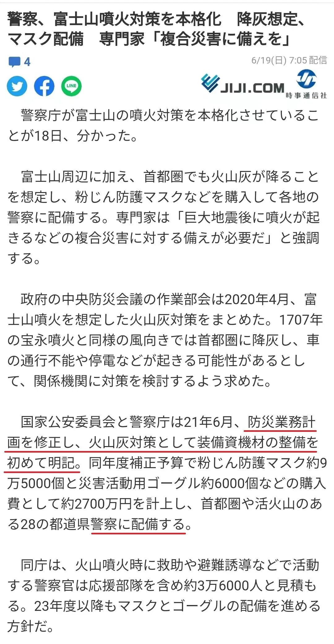 原版新闻里讲的事就是其中一桩普通的“防灾物资采购配置”的年度计划。万一火山爆发,火山灰落下,为了对应这个问题,得给警察们配备防尘口罩和护目镜。