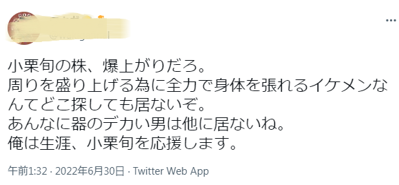 “小栗旬的评价会暴涨吧。能为了活跃周围气氛而全力拼的帅哥,上哪儿找都没有哦。没有像他那样的豪气男人。我一辈子都支持他。”