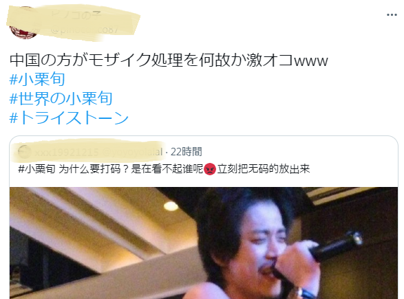 而这边本来在关注小栗旬裸照事件的日本网民,见到中国网民发的推特,看不太懂中文,但看懂了表情:不知为啥,中国人对打码处理这点很生气。