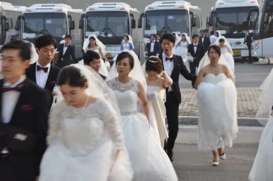 “统一教会”的集体婚礼,男女双方都是教会信徒。婚前彼此不认识,由教会匹配,决定谁和谁结婚。