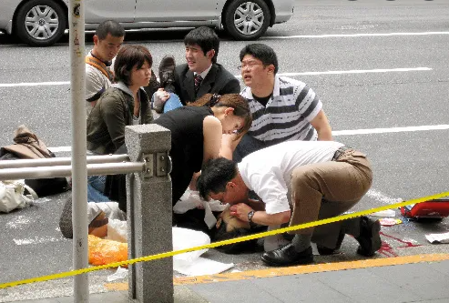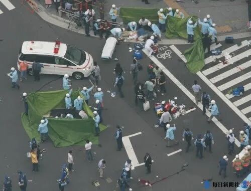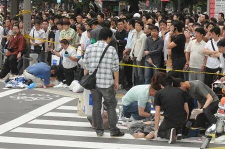 加藤智大手持一把刀下车,骑在被车撞倒的路人身上,连扎数刀。起身后,再对过路行人实行无差别杀戮。