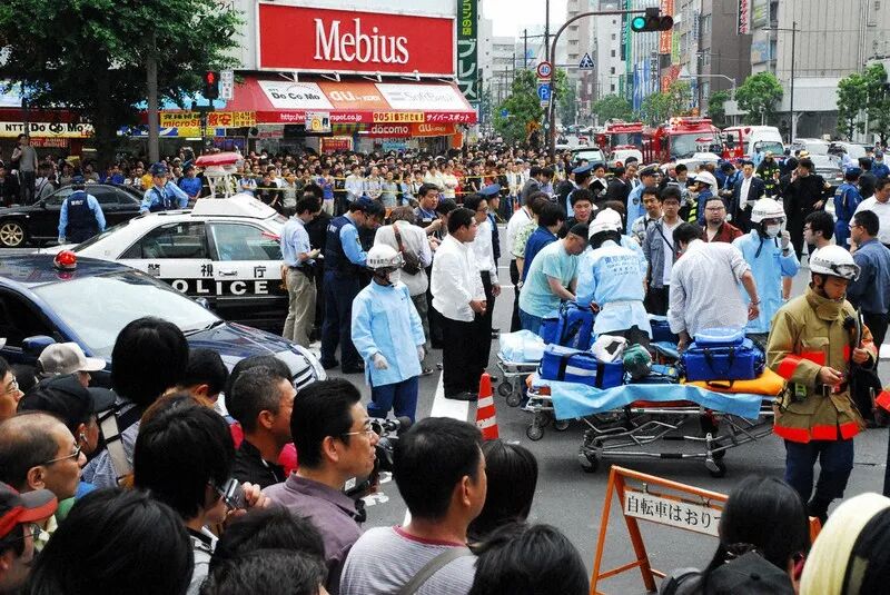 2008年6月8日,星期天,中午12点半,时年25岁的加藤智大驾驶一辆卡车冲上东京秋叶原十字路口。正放心逛街的行人们,没想到会有车辆开进来,更没想到那辆车会发了疯一般的横冲直撞,陆续有人被卡车撞倒。