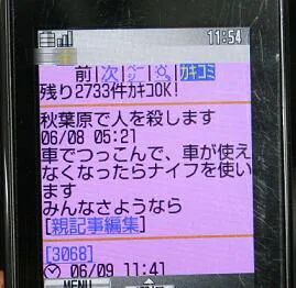 2008年6月8日凌晨5点21分,他用手机在某网络社区发帖,预告今天将要发生秋叶原杀人事件:开车冲进去,车不能用了,再用刀。再见了诸位。