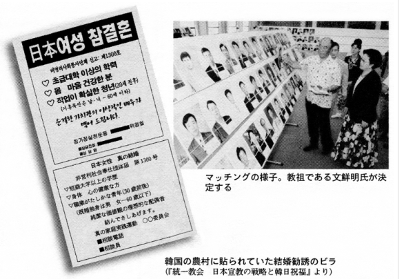 “统一教”的传教小海报到了韩国农村,就成了宣扬入教后的大好处:由教主配对安排,能和日本高学历女性/年轻女人/漂亮女人结婚。
