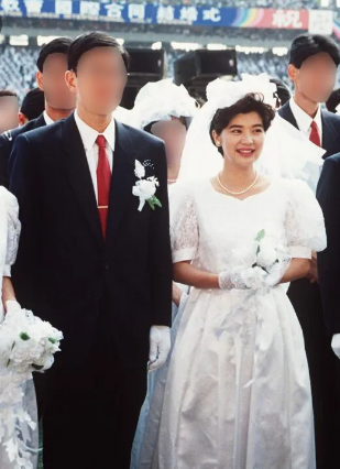 1992年的集体婚礼上,当时正当红的日本女星樱田淳子也在新娘行列里。