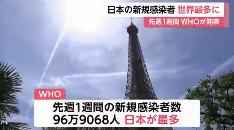 7月27日,WHO(世界卫生组织)对外发布了最新报告:日本在全世界所有国家里,上周一周新增感染人数最多,达96万9068人。