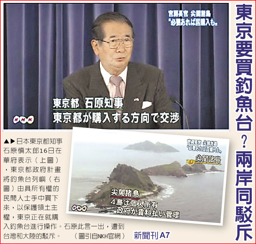 2012年4月,当时的东京都知事石原慎太郎出于个人政治野心,对外推出所谓的“买岛计划”。