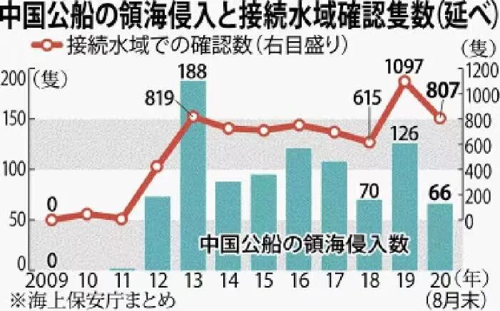 日本海上保安厅统计的2012~2020年期间,中国公船“入侵领海及毗连海域”数量。