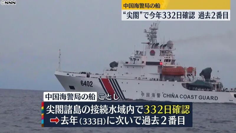 日方根据统计数据:2021年全年有332天,确认到中国海警船在钓鱼岛毗连海域内活动。