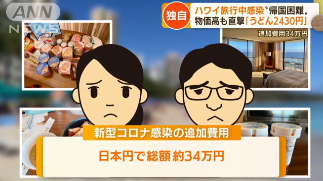 因为感染新冠,而不得不追加产生的费用,算下来差不多34万日元。两人没有特地购买海外旅游保险,现在就看信用卡附带的海外旅游保险能给负担多少了。