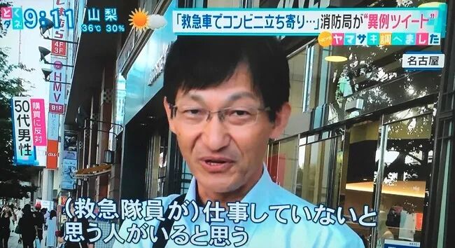 50多岁男性:不赞成救急队员进便利店买水买的,因为会有人觉得他们(工作时间)不在工作。