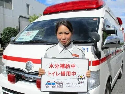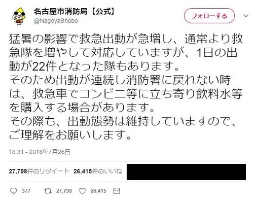 “受酷暑影响,出动救急次数急增,比通常增加救急队数量来对应。有的队一天出动了22次。为此,连续出动无法返回消防署时,救护车有时会停靠便利店,购入饮料水等。那也是为了维持出动势态。敬请理解。”