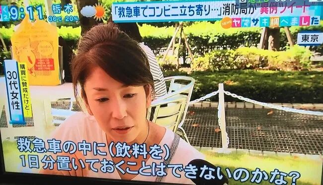 30多岁女性:赞成救急队员们应及时补充水分,但不赞成他们进便利店买水。不能在救护车里放够一天的饮用水吗?