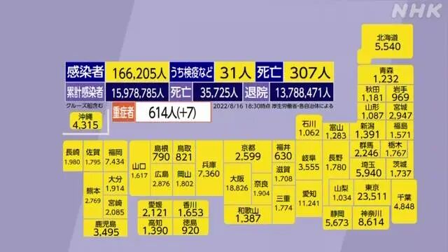 8月16日一天,全日本新增16万6205名感染者,死亡311人。