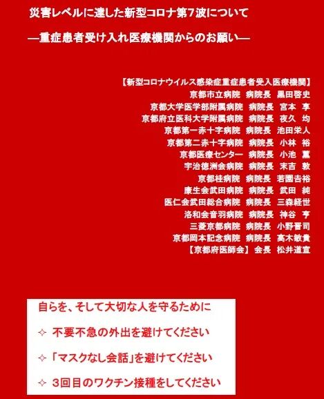 8月15日,京都大学附属医院等14家医疗机构发布联合声明。称这次的疫情第七次高峰已达到“灾害级别”,并提到“我们救不了本来能救的生命”这一残酷现状。