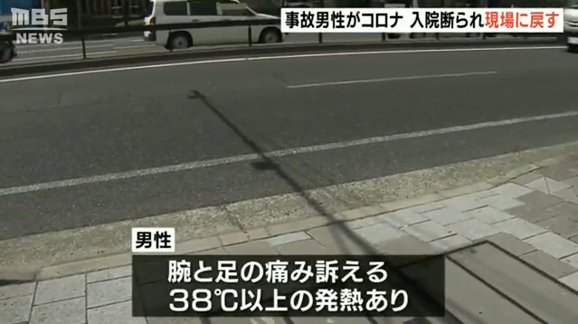 尼崎市中消防署接到119电话后,出动救护车前往事故现场。小哥的大致伤情是手脚有明显疼痛,并且伴有38℃以上的发烧症状。