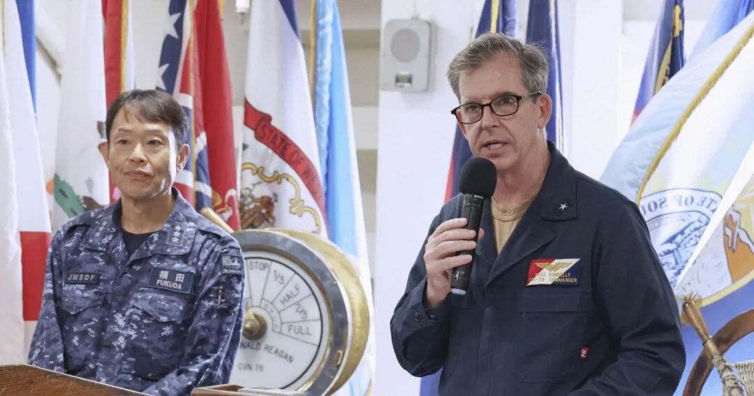 8月5日,美国第五航母打击群司令麦克・唐纳利与日本海上自卫队护卫舰队司令福田达也,在距离日本厚木500公里的太平洋上召开联合记者会。