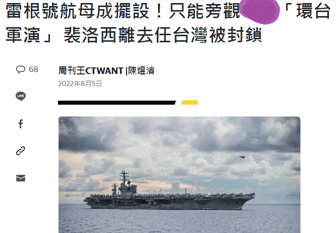 湾湾名嘴们绘声绘色地描述:“佩洛西一落地,雷根号就开始往东岸跑了。”