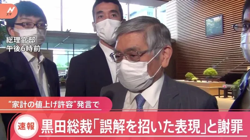 《日网民怒斥“我没接受物价上涨”,日银总裁黑田紧急收回发言并谢罪》