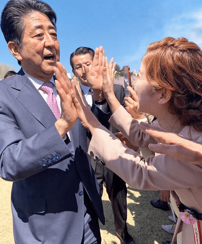 三年前,她抓住了一次更大的炒作机会:受邀出席安倍晋三主办的赏樱大会,抓拍到这张二人击掌的照片。