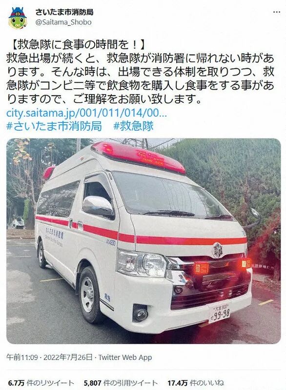 《日本一消防局的推文火爆全网:救急人员也要吃饭喝水上厕所啊!》
