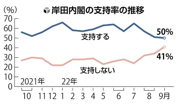 与之相伴的是岸田文雄的内阁支持率在持续下降,已降到50%的新低。而不支持率已涨到41%的新高(读卖新闻统计数据)。