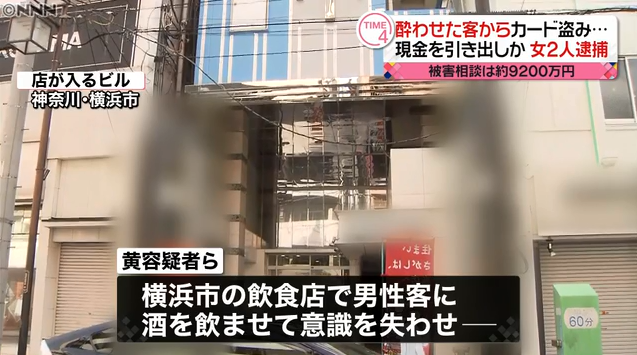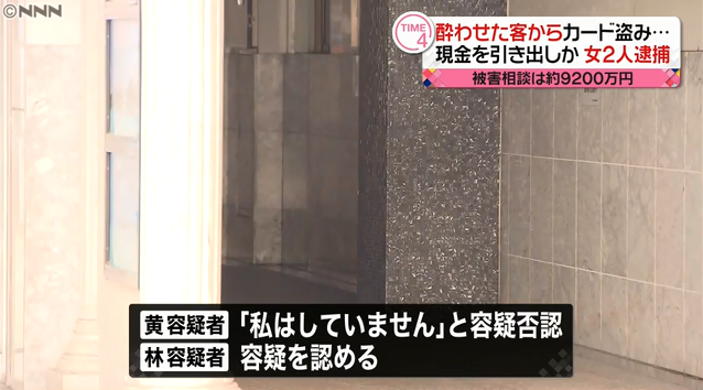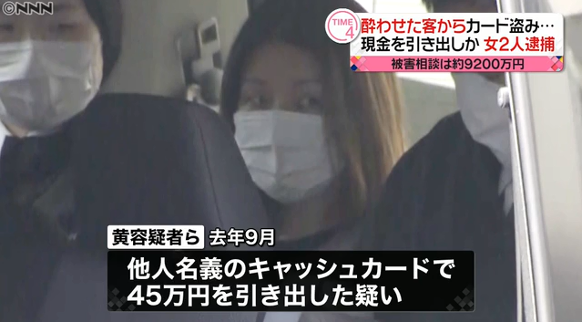 两人涉嫌于去年9月,在黄爱珠经营的陪酒俱乐部里,刻意将一名男客灌酒灌到酩酊大醉后,盗取其随身携带的信用卡,去附近便利店内的ATM提走45万日币。