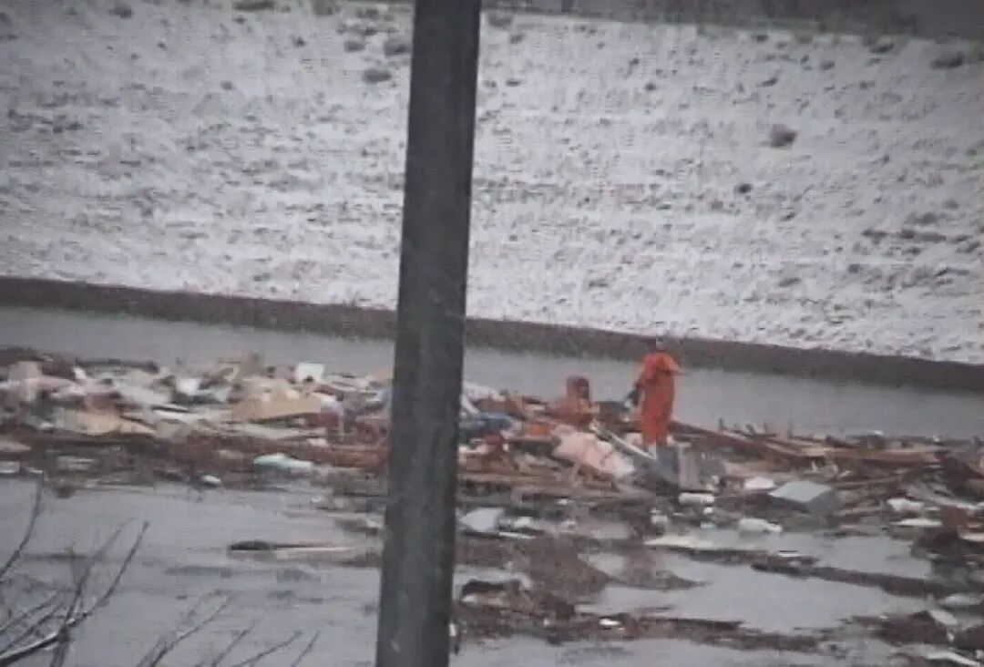 被海啸推着往内陆方向去,经过桥下时,桥与水面之间仅有1米高。房顶和墙壁被桥梁撞毁,事务所就剩下一块地板。
