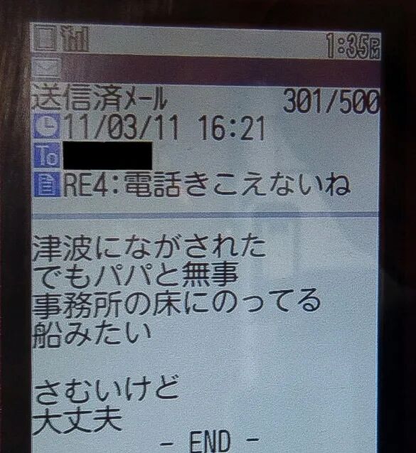 不知道最后会被冲到哪儿去,能不能安全爬上岸,但此时此刻还活着。安倍志摩子身上带着手机,趁着有一格信号的瞬间,赶紧给孩子们发短信。