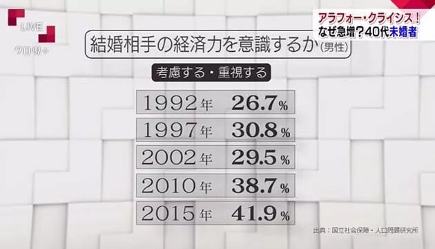 1992年时,26.7%的男性在意。到了2015年,这个比例猛增至41.9%。十个日本男人,至少有四个在意结婚对象的经济力。