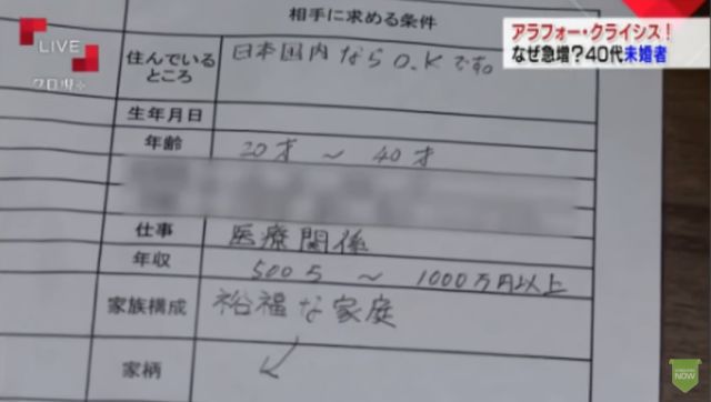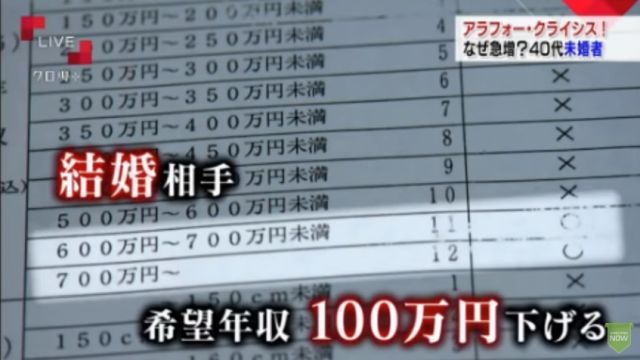 她希望男方40来岁,年薪不低于700万日元(折合人民币41万)。因为合适人选太少,现在把这个标准额降低了100万,年薪600~700万也行吧。